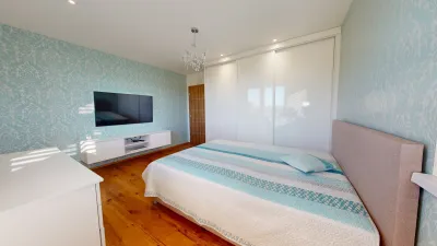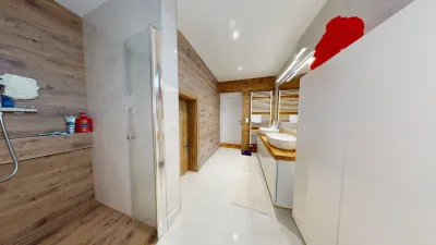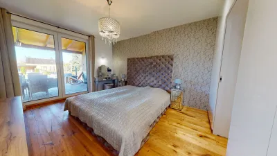 - Hausherrnschlafzimmer mit einem begehbaren Kleiderschrank, einem privatem Badezimmer mit Walk-In Dusche sowie einem Ausgang auf die Terrasse.