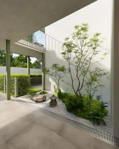 Die Anlage ist in Quaderform gestaltet und wird von begrünten Fassaden und einem Gründach ummantelt. Vor dem Eingang wird ein japanischer Garten den Eingang zieren, der mit Kieswegen, stilvollen Pflanzen und ruhigen Gestaltungselementen eine besondere Atmosphäre schafft. Die Freiflächen bestehen aus Terrassen, Balkonen und Eigengärten. Im grünen Innenhof ist ein Naturspielplatz vorgesehen und eine Gemeinschaftsgarten. Begrünte Fassaden und ein ökologisches Gründach tragen zu einem angenehmen Mikroklima bei.