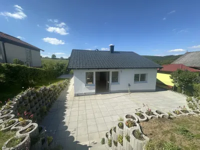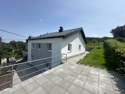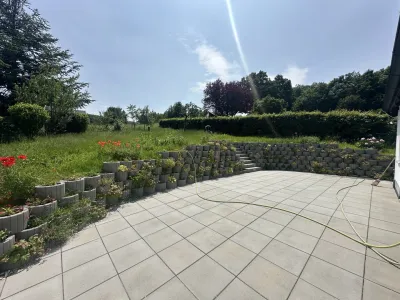 Auf der Südseite des Hauses stehen großzügige Terrassenflächen zur Verfügung – ideal für entspannte Nachmittage im Freien oder gesellige Familienfeste.