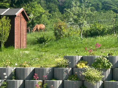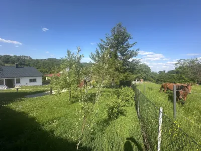 Der liebevoll gestaltete Traumgarten grenzt direkt an eine Pferdeweide und eröffnet einen einzigartigen Blick in die Natur – ein Paradies für Naturliebhaber und Ruhesuchende.