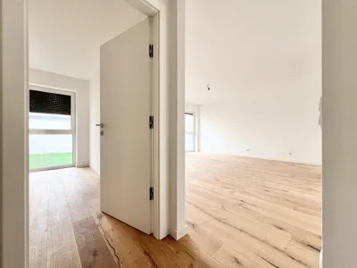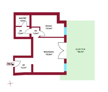 Die Wohnung Top 2 verfügt über eine Wohnfläche von ca. 51,1 m² und bietet eine durchdachte Raumaufteilung mit separatem Schlafzimmer, Wohnküche, Abstellraum sowie Bad mit WC. Vom Wohnbereich aus gelangt man direkt in den ca. 38,7 m² großen Garten.