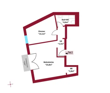 Die Wohnung Top 3 bietet eine Wohnfläche von ca. 49,4 m² und setzt sich aus einer Wohnküche, einem Schlafzimmer, einem Badezimmer mit WC, einem Abstellraum sowie einem Vorraum zusammen. Von der Wohnküche aus gelangt man auf die ca. 2,5 m² große Terrasse.