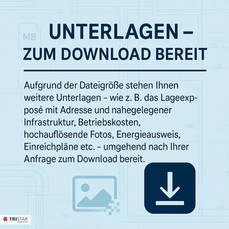 Aufgrund der Dateigröße stehen Ihnen weitere Unterlagen – wie z. B. das Lageexposé mit genauer Adresse und nahegelegener Infrastruktur, Betriebskosten, hochauflösende Fotos, Energieausweiss, Einreichpläne etc. – umgehend nach Ihrer Anfrage zum Download bereit.