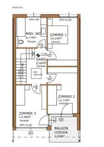 Im Obergeschoss ermöglicht ein rund 6,06 großer Vorraum den Zutritt zu den drei (Schlaf-)Zimmern, die die Größen von 14,25 m², 13,72 m² und 12,98 m² haben.