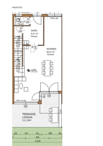Sie betreten das Haus über einen rund 8,41 m² großen Vorraum, von dem aus die Treppe in das Obergeschoss führt. Vom Vorraum aus betreten Sie einerseits das WC Nr. 1 (1,98 m²) sowie den großzügigen, sonnigen Wohn-, Ess- und Küchenbereich des Hauses, welcher eine Fläche von rund 45,21 m² ausweist. Davor positioniert befindet sich Ihr "Freiraum" mit Terrasse und Kleingarten!