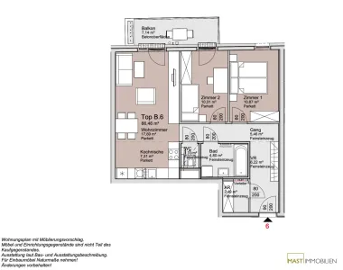 Die Wohnung befindet sich im 1. Liftstock und verfügt über 66,46 m² Wohnfläche + einen 7,14 m² großen Balkon.