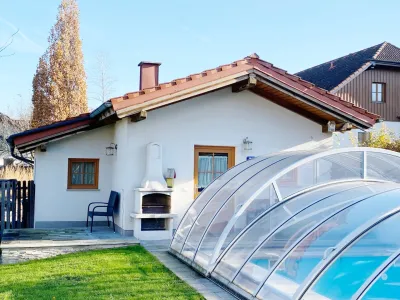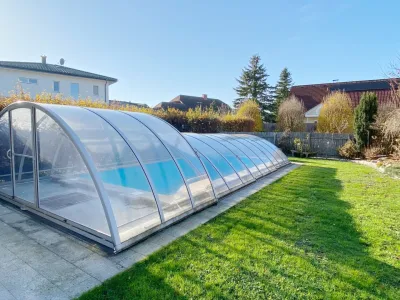 Der 4 x 8 m große Pool mit Eckeinstieg ist durch seine Überdachung sehr lange im Jahr mit angenehmen Temperaturen nutzbar. Das Poolhäuschen mit gemütlichem "Stüberl" und eigenem Sanitärbereich sowie der kleinen Terrasse lädt zu gemütlichen Stunden mit Familie und Freunden.