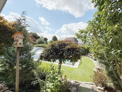 Ein Paradies für Erwachsene und Kinder ist der sehr große Garten mit Pool samt Poolhaus und Schwimmteich!