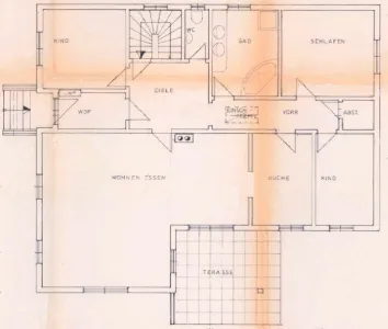 Erdgeschoss: sehr großzügiger Wohn-/Essbereich mit Ausgang auf die Terrasse und in den Garten, Küche, Schlafzimmer, 2 Kinderzimmer, Bad mit Wanne und Dusche, WC, Abstellraum, Vorraum, Windfang