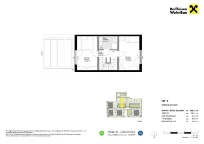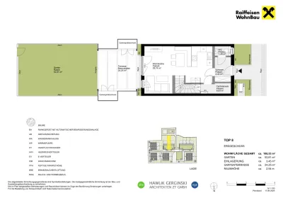 * Reihenmittelhaus Top 8: Wohnfläche ca. 108,53 m², Gartenterrasse ca. 24,25 m², Terrasse ca. 8,93 m², Garten ca. 52,81 m², KP € 695.500,--belagsfertig; KP € 735.500,-- schlüsselfertig