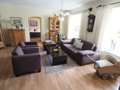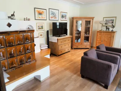 Ein Kachelofen im Wohnzimmer strahlt eine behagliche Wärme aus und lädt zum Verweilen ein.