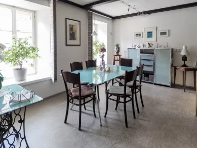 Das denkmalgeschützte Gebäude erstreckt sich über 2 Geschosse plus Keller, in dem sich die Haustechnik mit der Fernwärmestation zur Versorgung der Fußbodenheizung befindet.