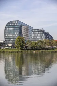 Eine großzügige Verglasung umhüllt die Stahlbetonskelettkonstruktion und sorgt für transparente Leichtigkeit. Die gekrümmte Fassade und die unterschiedlichen Raumtiefen ermöglichen eine flexible Gebäudenutzung.