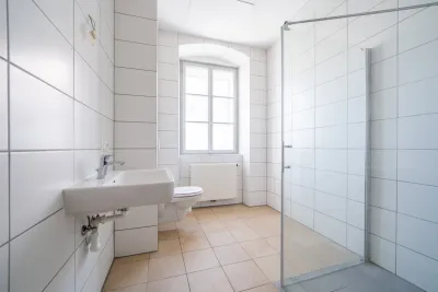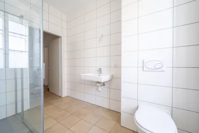 Das Badezimmer ist modern verfliest und mit einer praktischen bodenebenen Dusche ausgestattet.