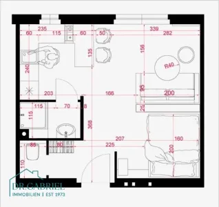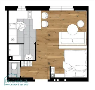 Vorraum, Wohn- Schlafraum, Küche, Bad, WC