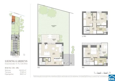 Die 2 - 5 Zimmer Wohneinheiten von LIESING GARDENS sind durchdacht gestaltet, von Loggien und Balkonen bis hin zu townhouse-artigen Anordnungen mit privaten Gartenflächen. Ein Doppelhaus inmitten eines privaten Gartens bildet das Highlight. Das architektonische Konzept schafft eine perfekte Balance zwischen städtischem Erscheinungsbild und Ruheoasen im Inneren.