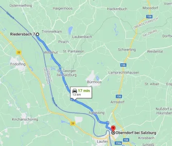 Der Ortsteil Riedersbach in St Pantaleon liegt knapp nach der Salzburger Landesgrenze im Innviertel und ist genau 30 Minuten vom Stadtzentrum von Salzburg entfernt. Mit der Lokalbahn sind es 41 Minuten ohne Umsteigen.