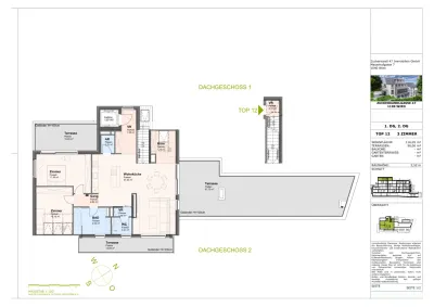 Die Wohnung verfügt über eine großzügige Wohnküche mit direktem Zugang auf zwei Terrassen, zwei Schlafzimmer (von einem der beiden gelangt man direkt auf die dritte Terrasse), ein Badezimmer (inkl. WC), ein seperrates WC mit Vorraum, einen Abstellraum, einen Gang und einen Vorraum.