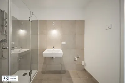 - Badezimmer mit Dusche, WC und Waschmaschinenanschluss