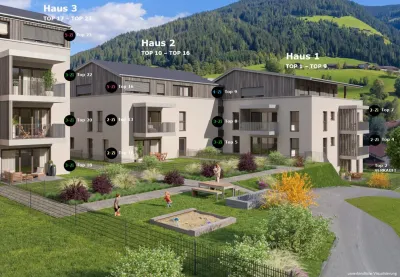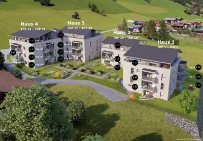 Wir errichten in leichter Hanglage in Oberau eine Wohnanlage mit voraussichtlich 31 Eigentumswohnungen in 4 Gebäuden. Die Objektadresse lautet: Lenzen 239, 6311 Oberau (Grundstück Nr. 307/3). Die Wohnanlage besteht aus einem Tiefgaragengeschoß / Eingangsebene, einem Gartengeschoß, einem Obergeschoß sowie einem Dachgeschoß. Es entstehen 2-, 3-, 4- und 5-Zimmer-Wohnungen immer mit Balkon oder Terrasse. Haus 1 + Haus 2 sowie Haus 3 + Haus 4 verfügen jeweils über ein gemeinsames Stiegenhaus sowie einen gemeinsamen Personenaufzug, die alle Geschoßebenen miteinander verbinden.