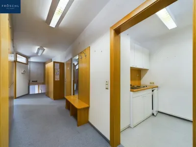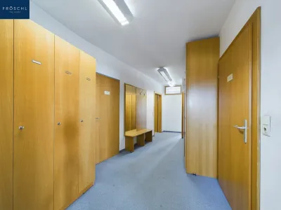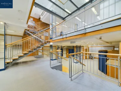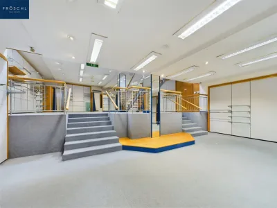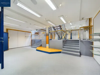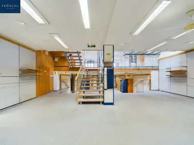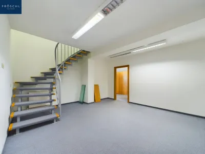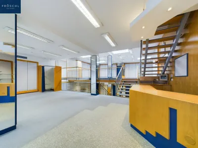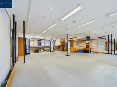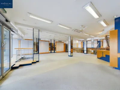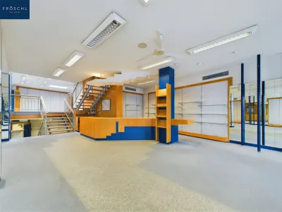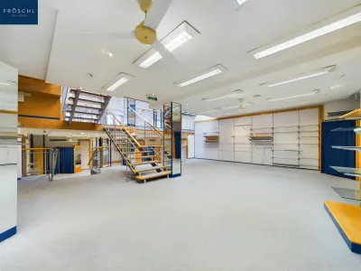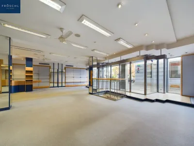 Straßenseitig besticht das Objekt durch eine einladende Auslagenpassage, die für hohe Sichtbarkeit sorgt und attraktive Präsentationsflächen bietet. Im Erdgeschoss stehen ca. 200 m² Nutzfläche zur Verfügung, wobei ein Drittel dieser Fläche auf einem leicht erhöhten Plateau liegt – ideal für Ausstellungs- oder Verkaufsbereiche.