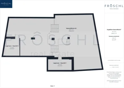 Das Untergeschoss erstreckt sich über zwei Ebenen und bietet insgesamt ca. 191 m² Fläche. Davon sind 24 m² als Lagerfläche nutzbar, perfekt für die Unterbringung von Waren und Betriebsmaterialien.