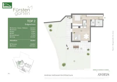 Die 2-Zimmer Wohnung mit ca. 58,68 m2 Wohnfläche, ca. 35,82 m2 Terrasse und ca. 105,12 m2 Garten verfügt über folgende Raumaufteilung: