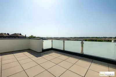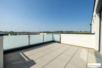 Eine optimal aufgeteilte 3 Zimmer Dachgeschosswohnung in Ausmaß von ca. 69 m² in südwestlicher Ausrichtung. Nach Eintritt in die Wohnung gelangen Sie ins Vorzimmer mit ca. 7,73 m². Das ca. 24 m² große Wohnzimmer bietet einen direkten Zugang auf die Dachterrasse im Ausmaß von knapp 23 m². Das Schlafzimmer ist ca. 12,32 m² groß und bieten daher ausreichend Platz für Ihre Möbel. Auch das Kinderzimmer mit ca. 10 m² bietet ausreichend Platz. Das modern & exklusiv gestaltete Badezimmer wird mit einer Wanne, WM-Anschluss und Waschbecken ausgestattet. Selbstverständlich ist das WC inkl. Handwaschbecken, separat begehbar. Der Abstellraum umfasst ca. 1,12 m².