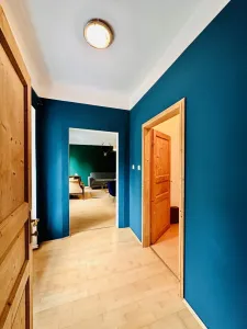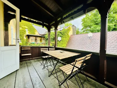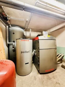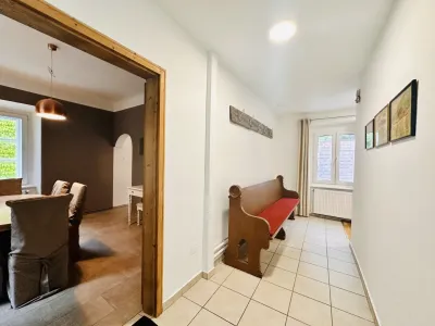 Besonders reizvoll sind der sonnige Innenhof mit einem rustikalen Holz-Balkon sowie der großzügige Garten hinter dem Haus, der viel Raum für Entspannung, gemeinschaftliche Nutzung oder kreative Gestaltung bietet. Beheizt wird das Gebäude über eine zentrale Pelletsheizung – eine nachhaltige und effiziente Lösung für zeitgemäßes Wohnen. Ein architektonisches Detail, das ins Auge fällt: Pro Fensteröffnung sind sowohl Kunststoff- als auch Holzfenster verbaut. Diese besondere Kombination bietet funktionale Vorteile bei Wärmeschutz und Isolierung, aber auch optisch einen interessanten Akzent.